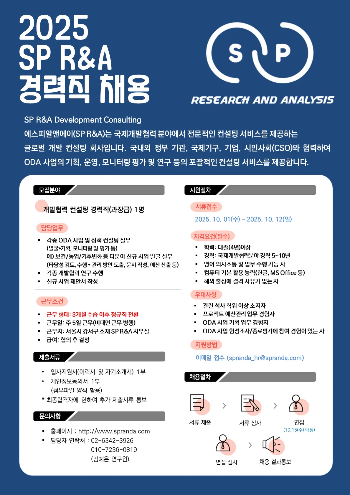 [2025. 10. 1.] 에스피알앤에이(주) 개발컨설팅 경력직 채용 공고(마감)